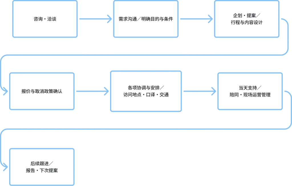 | 举办地:大阪 活动:投资促进商务洽谈会 | 负责活动的企划与运营,并协助邀请日本企业参与商务洽谈。 | 30人 / 2天行程 |
